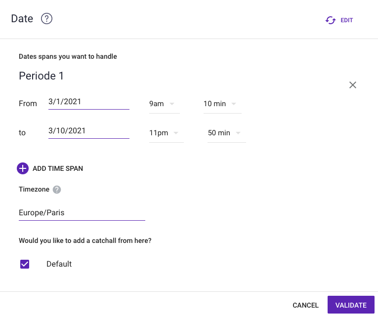 You can set date ranges with the hours of beginning and end of the period. One or several periods can be configured.