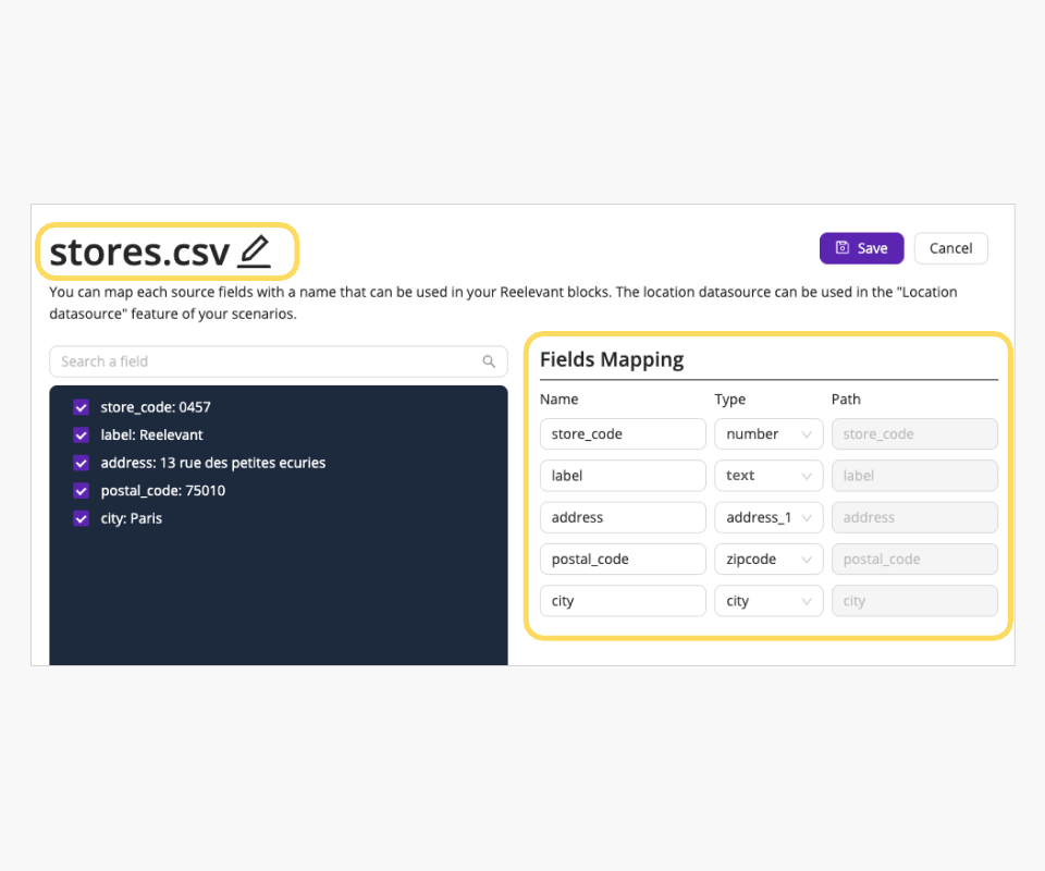 Some mapping fields are automatically detected by the Data Source because they are required for importing a location data feed. Your file must include the following fields: store code, label, address, postal code, and city.