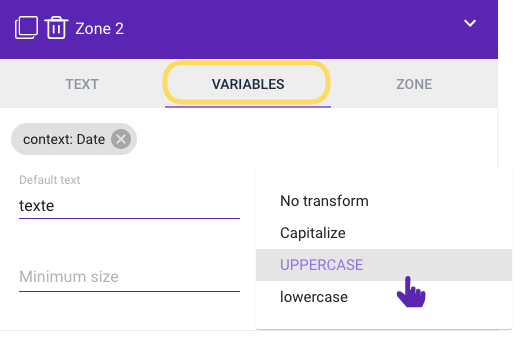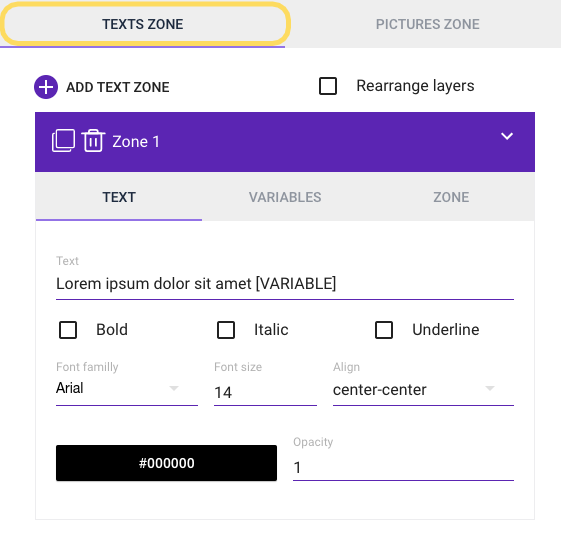 The text zone allows you to add static or dynamic text (using variables) to the content.