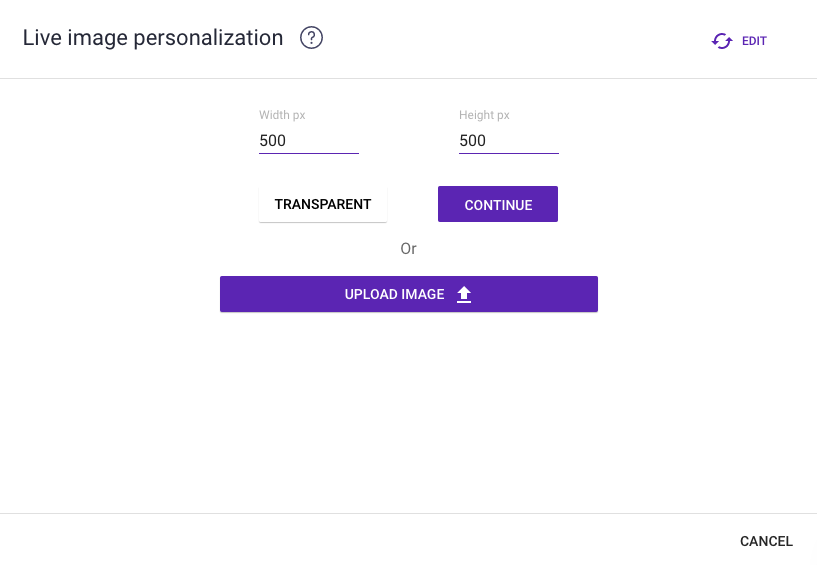 To start using a Live Image Personalization, you can either choose a background image to import from your computer or import nothing and instead simply set your image size and background color.