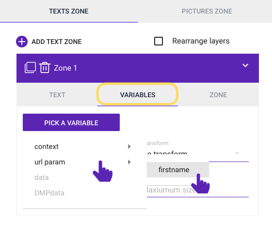 Here, you can select the variables that will make your text box dynamic. You must first choose the data source that will provide the variable to be displayed in the text.
