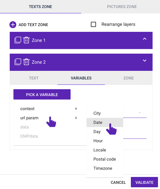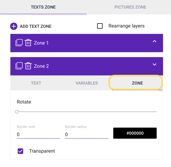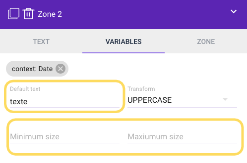 The text zone allows you to add static or dynamic text (using variables) to the content.