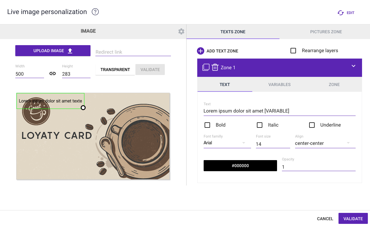 Once the background image has been imported or the image criteria has been configured, our dynamic image tool lets you insert static or dynamic text and image areas that can be updated in real time.