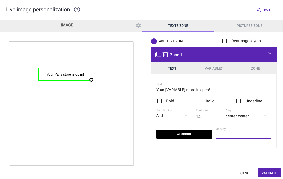 The example below tells the customer that the xx store near them is open, using the Live Image Personalization.