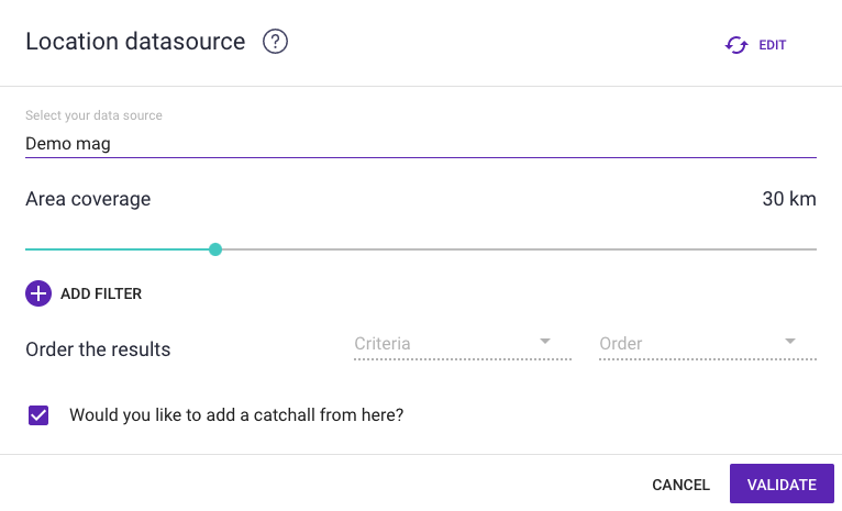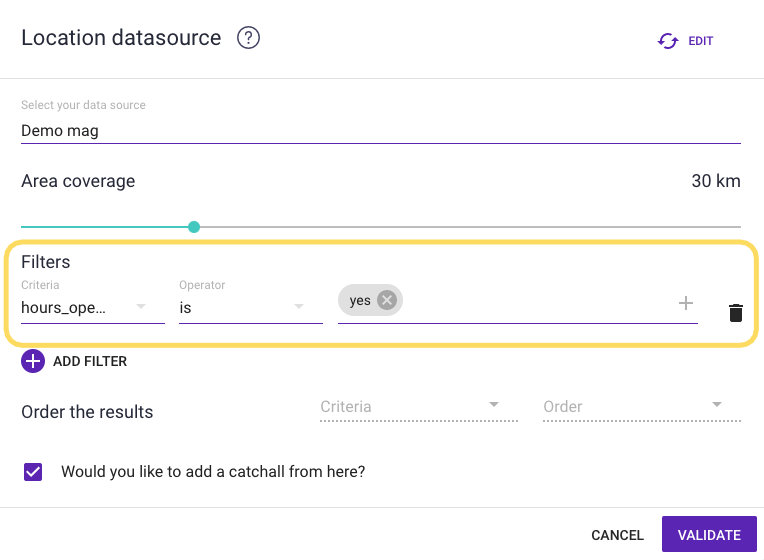 On the left, the “Criteria” menu includes all the fields present in your data source. Here, let’s consider the example of a filter on stores open on Sundays that you want to communicate about (without communicating about the other stores in the file).