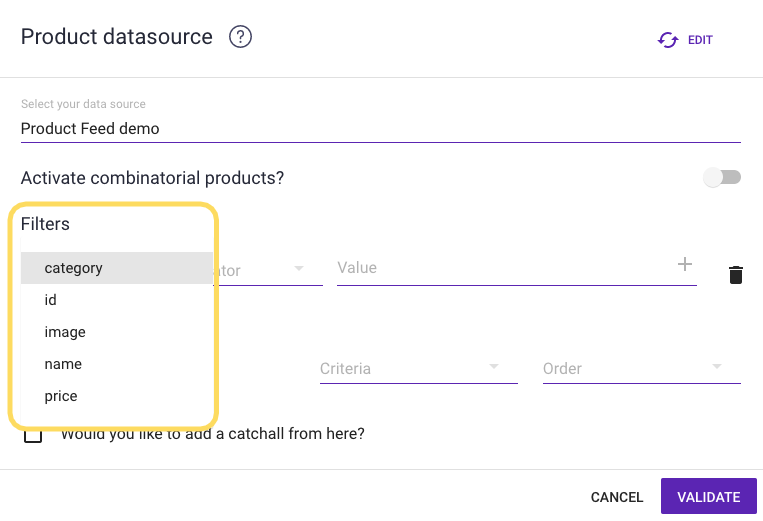 The “Criteria” field on the left is for all the fields of your feed previously defined in the Data Source.