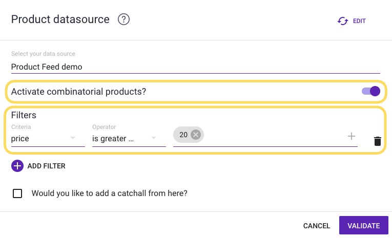 Before using the “Product datasource” feature, it is important to know the fields in your feed. Your scenario can be configured only with these fields.