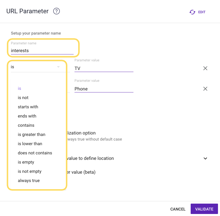 Here is an example for the scenario with the “Interests” URL parameter: