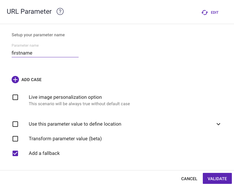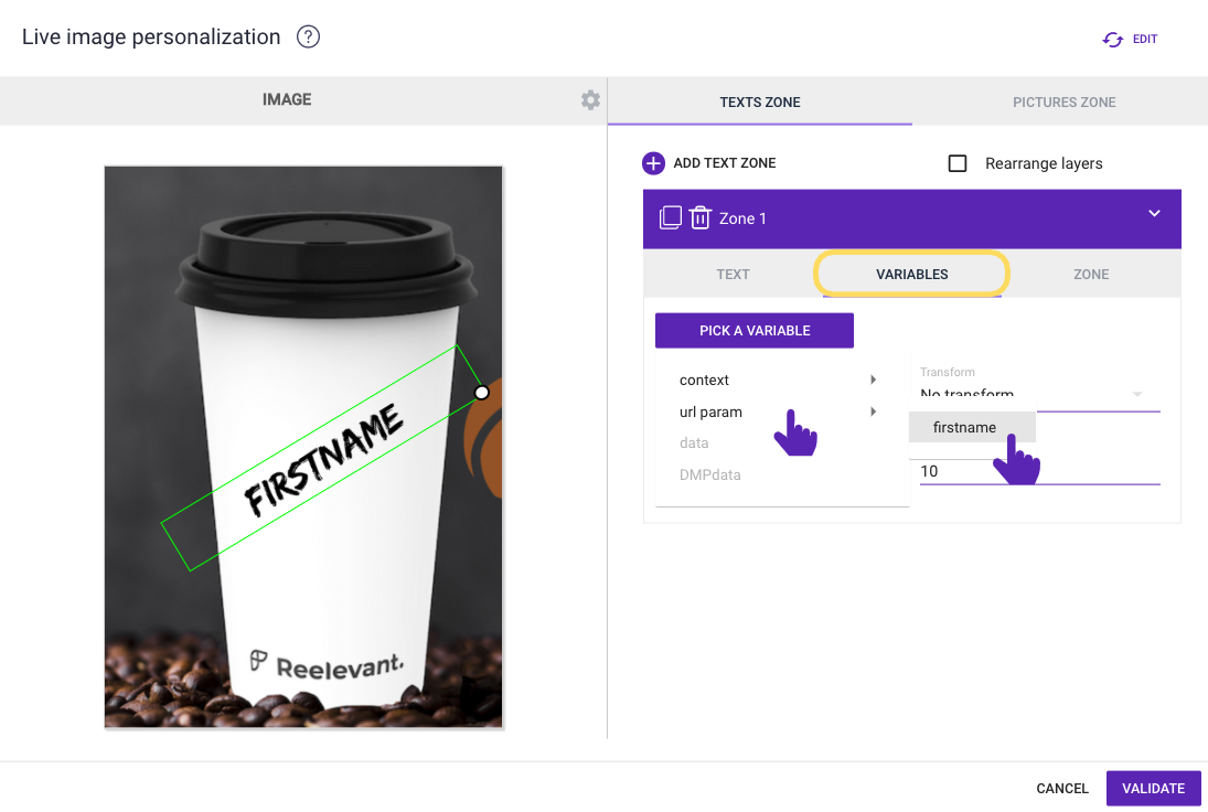 In your text zone, all you have to do is choose the variable from the “param url” menu (the one you set up earlier in your URL parameter, example "firstname") so that it appears automatically on the image you choose.