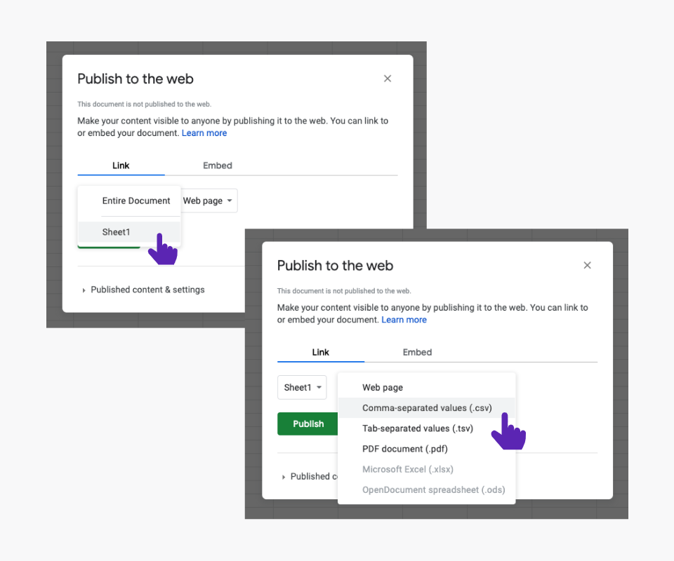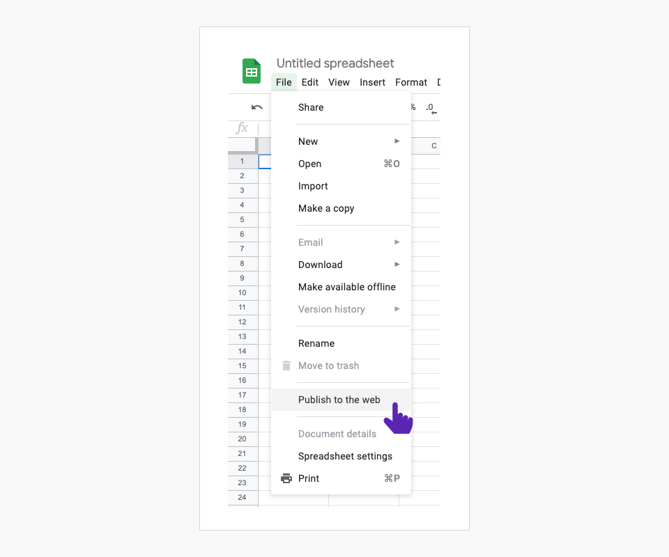 1. Go to your Google Sheet, click “File” and then “Publish to the web”.