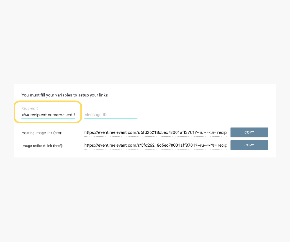 http://event.reelevant.com/i/111222333444555666?~ru~=<%= recipient.customerid %>